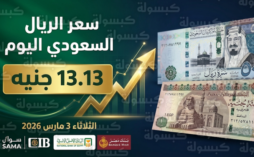 شهدت أسعار صرف الريال السعودي مقابل الجنيه المصري قفزة جديدة وملحوظة في تداولات اليوم الثلاثاء 3 مارس 2026، حيث سجل متوسط السعر الرسمي في البنك المركزي المصري 13.13 جنيه للبيع، وسط فارق سعري تجاوز 30 قرشاً مقارنة بتداولات أمس الاثنين.