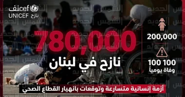 تواجه الدولة اللبنانية اليوم، الأربعاء 11 مارس 2026، أزمة إنسانية متسارعة وغير مسبوقة مع استمرار التصعيد العسكري، حيث كشفت منظمة الأمم المتحدة للطفولة (يونيسيف) في أحدث بياناتها عن أرقام صادمة تعكس حجم المعاناة المتفاقمة، فقد أجبرت العمليات العسكرية والغارات الجوية المكثفة نحو 780 ألف مواطن على مغادرة منازلهم قسراً، بحثاً عن مناطق أكثر أمناً بعيداً عن استهدافات الضاحية الجنوبية لبيروت، ومناطق البقاع، والجنوب اللبناني.