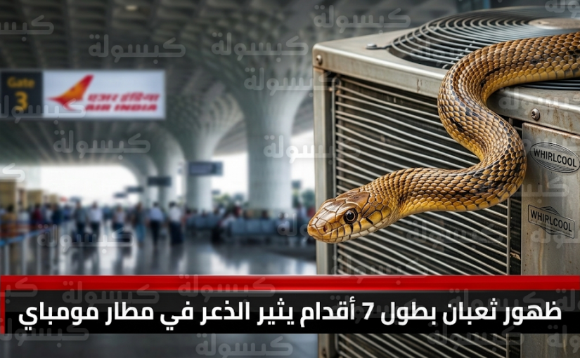 سادت حالة من الاستنفار والذعر بين المسافرين والمارة في مطار مومباي الدولي اليوم الخميس 5 مارس 2026، وتحديداً بالقرب من البوابة رقم (3) التابعة للخطوط الجوية الهندية، إثر ظهور مفاجئ لثعبان هندي ضخم يبلغ طوله نحو 7 أقدام، وأفاد شهود عيان بأن الثعبان كان متمركزاً أسفل مروحة وحدة تكييف خارجية، وبدا غير مكترث بالضجيج المحيط به، مما زاد من مخاوف المتواجدين في الموقع لحظة رصده.